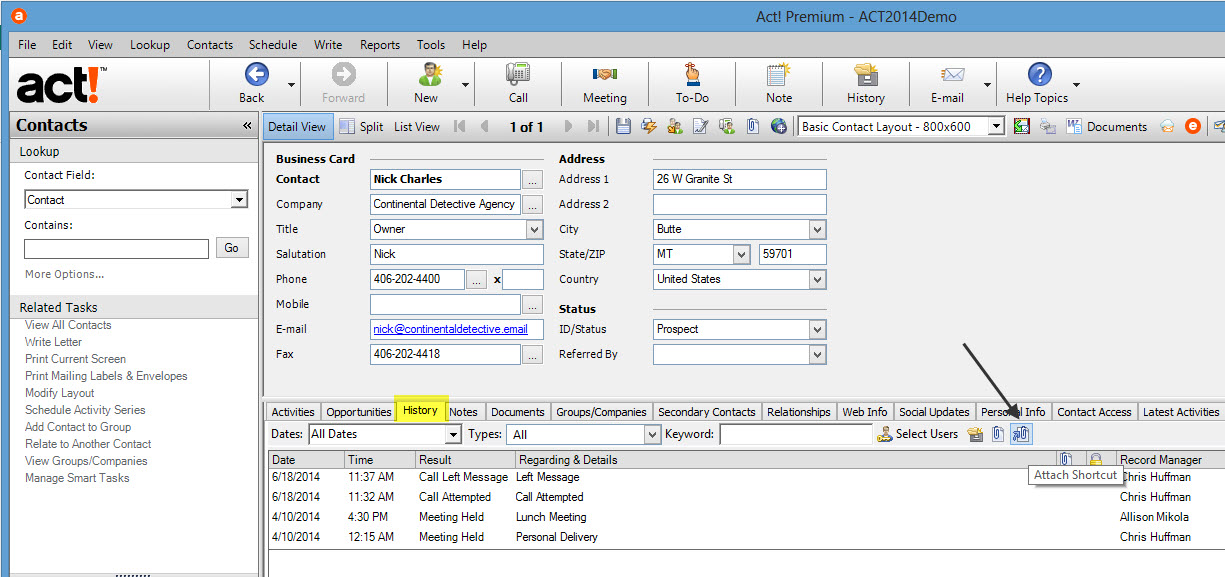 The shortcut option creates a hyperlink (much like a website does) and the documents tab allows you to quickly e-mail that attachment to that contact record in Act!.