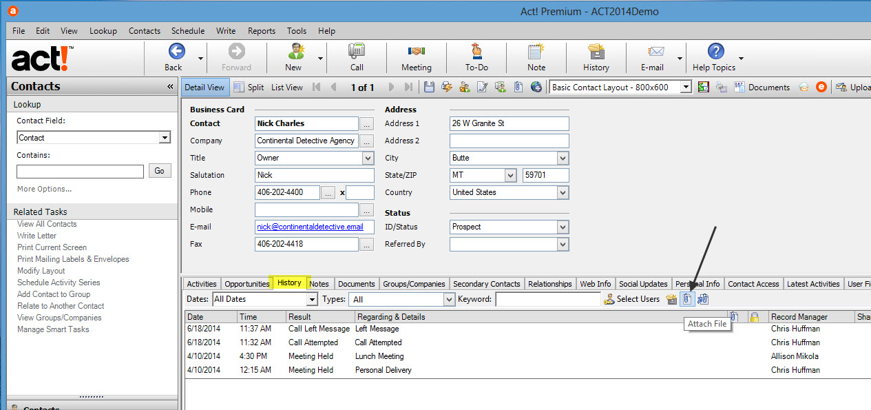 In Act!, press CTRL-I. The, you can attach a file to the current contact open in Act!. You can also go to the history tab and click the paper clip icon and attach either a shortcut (hyperlink) to a file or attach the whole file to Act!. Or, you can visit the documents tab and attach a document there also. Attaching the file actually copies the file from the original location to the Act! filing system, which is a best practice for remote synchronizing laptops.